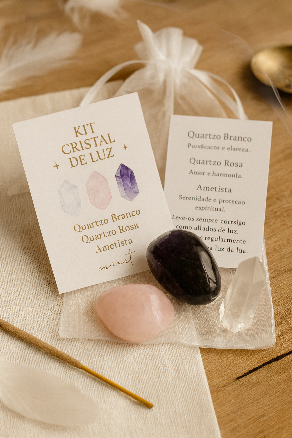 Contém Quartzo Branco, Quartzo Rosa e Ametista — três cristais que formam uma trindade de purificação, amor e proteção espiritual.