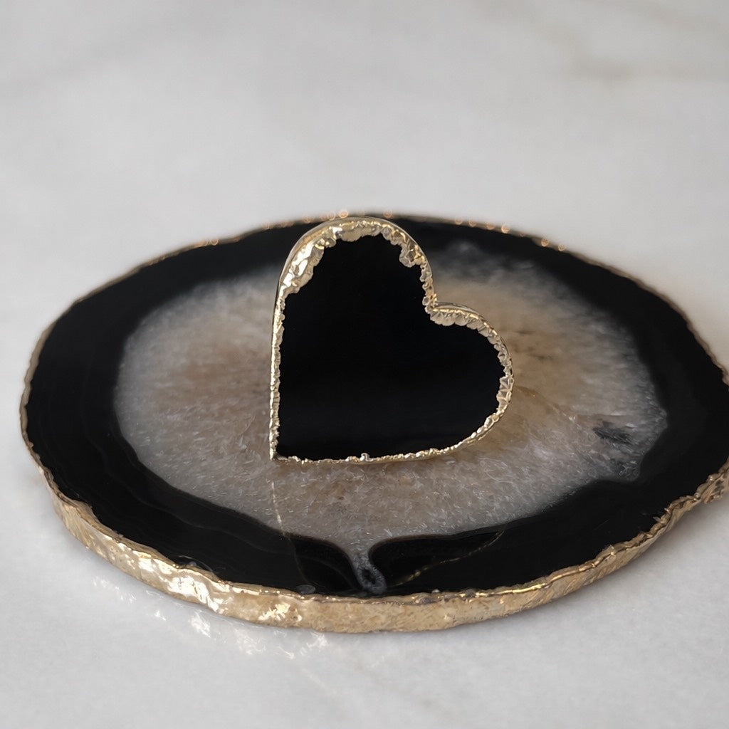 A bandeja em ágata preta natural, banhada a ouro, traz sofisticação e profundidade energética, sendo ideal para servir, decorar ou compor rituais de autocuidado e recepção.