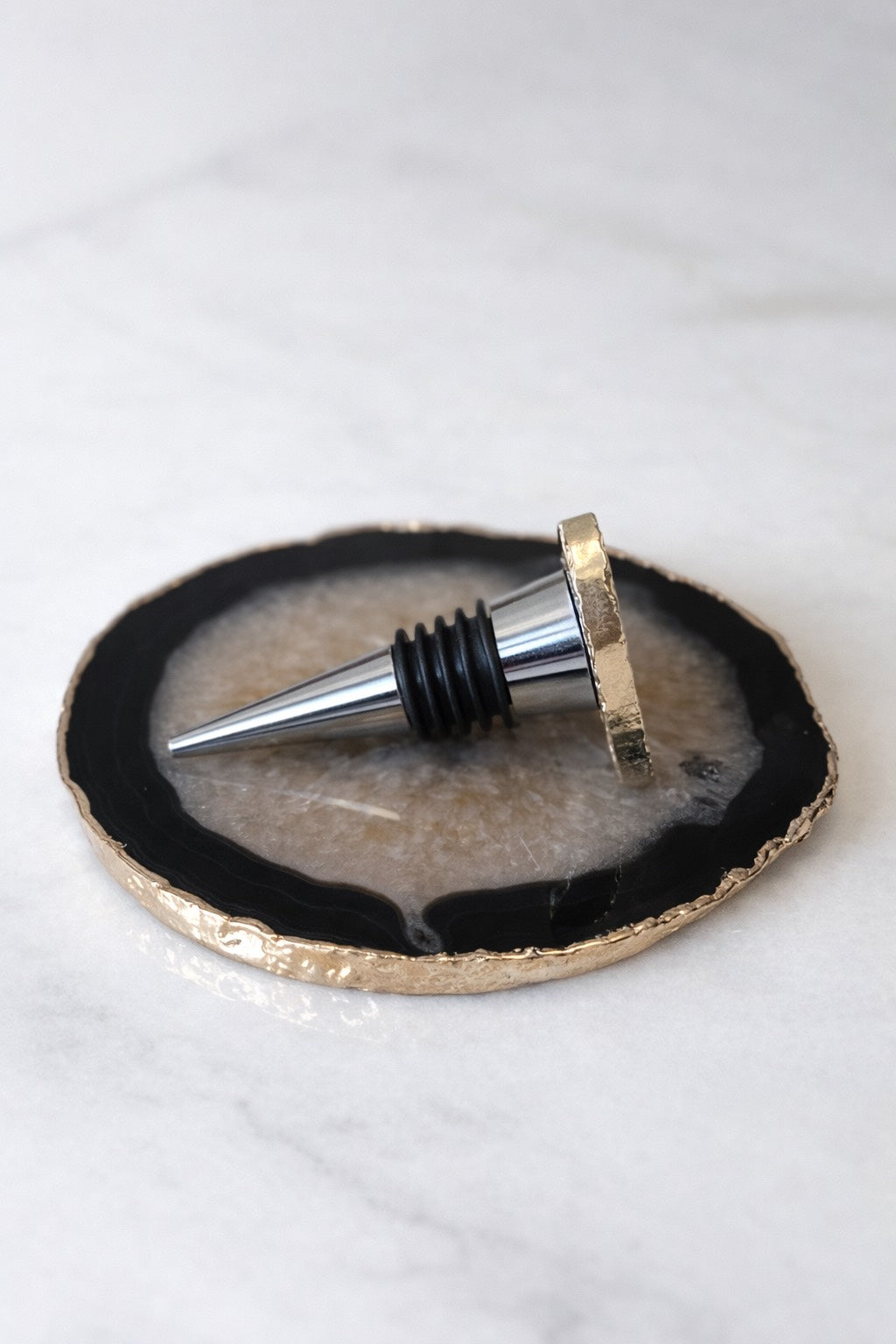 O stopper em ágata em formato de coração, também banhado a ouro, une funcionalidade e simbolismo ,preserva o vinho enquanto representa conexão, amor e presença.