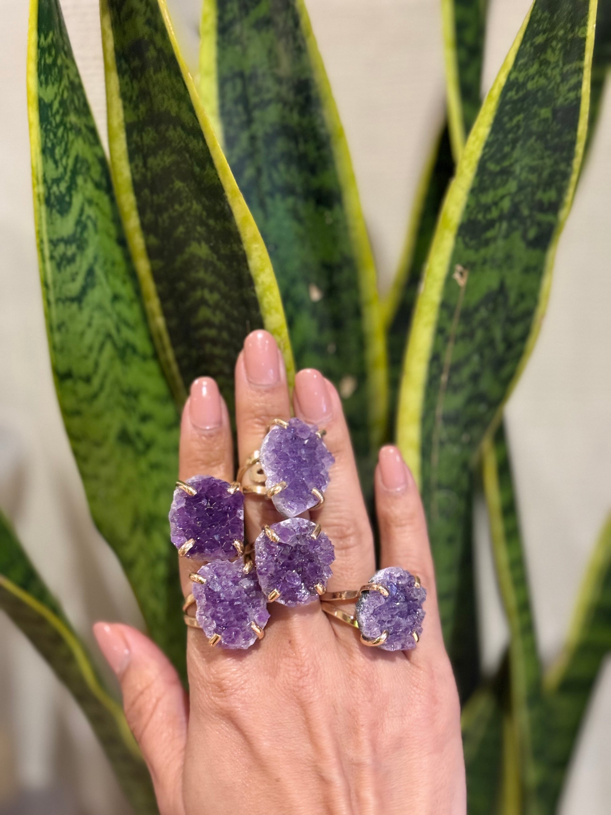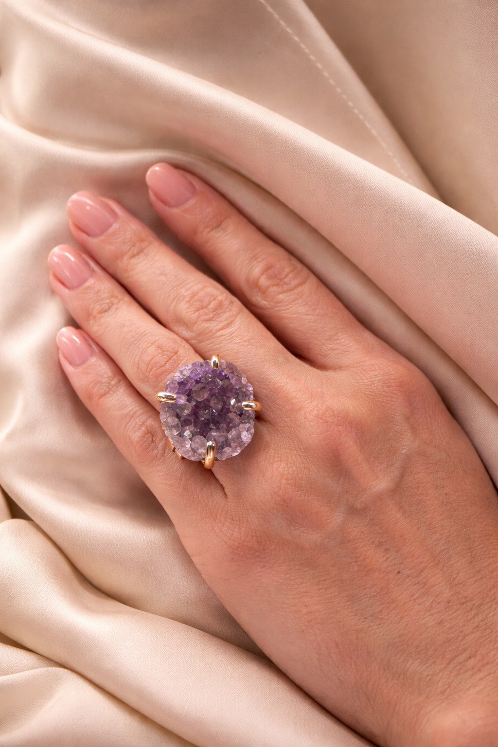 A ametista, em estado natural, atua de forma subtil sobre a mente e a intuição, ajudando a acalmar os pensamentos, elevar a frequência e alinhar a energia do dia a dia.