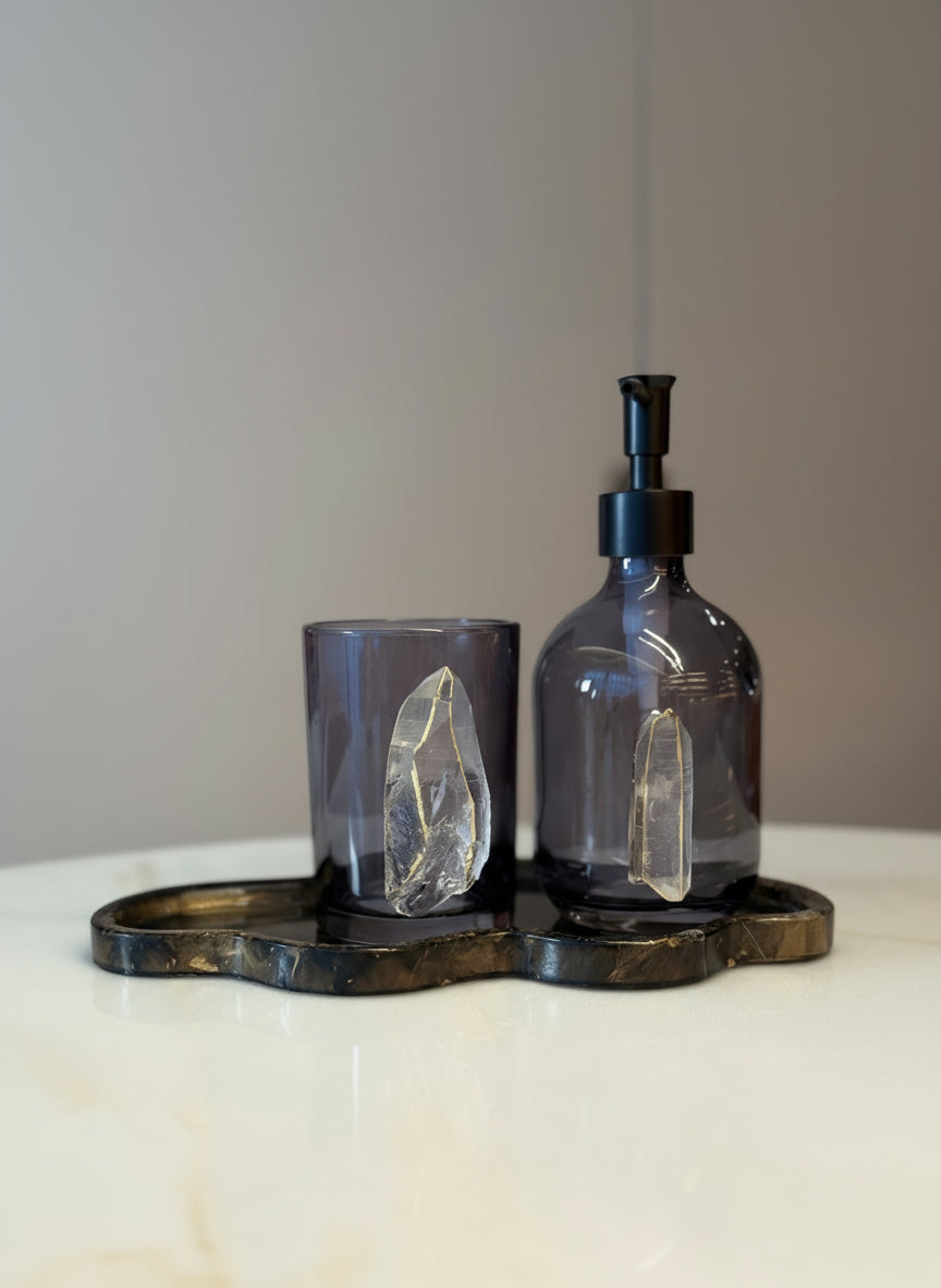 Para quem procura mais do que decoração procura energia, presença e propósito.Este conjunto exclusivo inclui dispensador, copo e base artesanal, todos adornados com Cristal Lemuriano natural — um cristal raro, conhecido pela sua energia ancestral, sabedoria intuitiva e potente capacidade de cura.