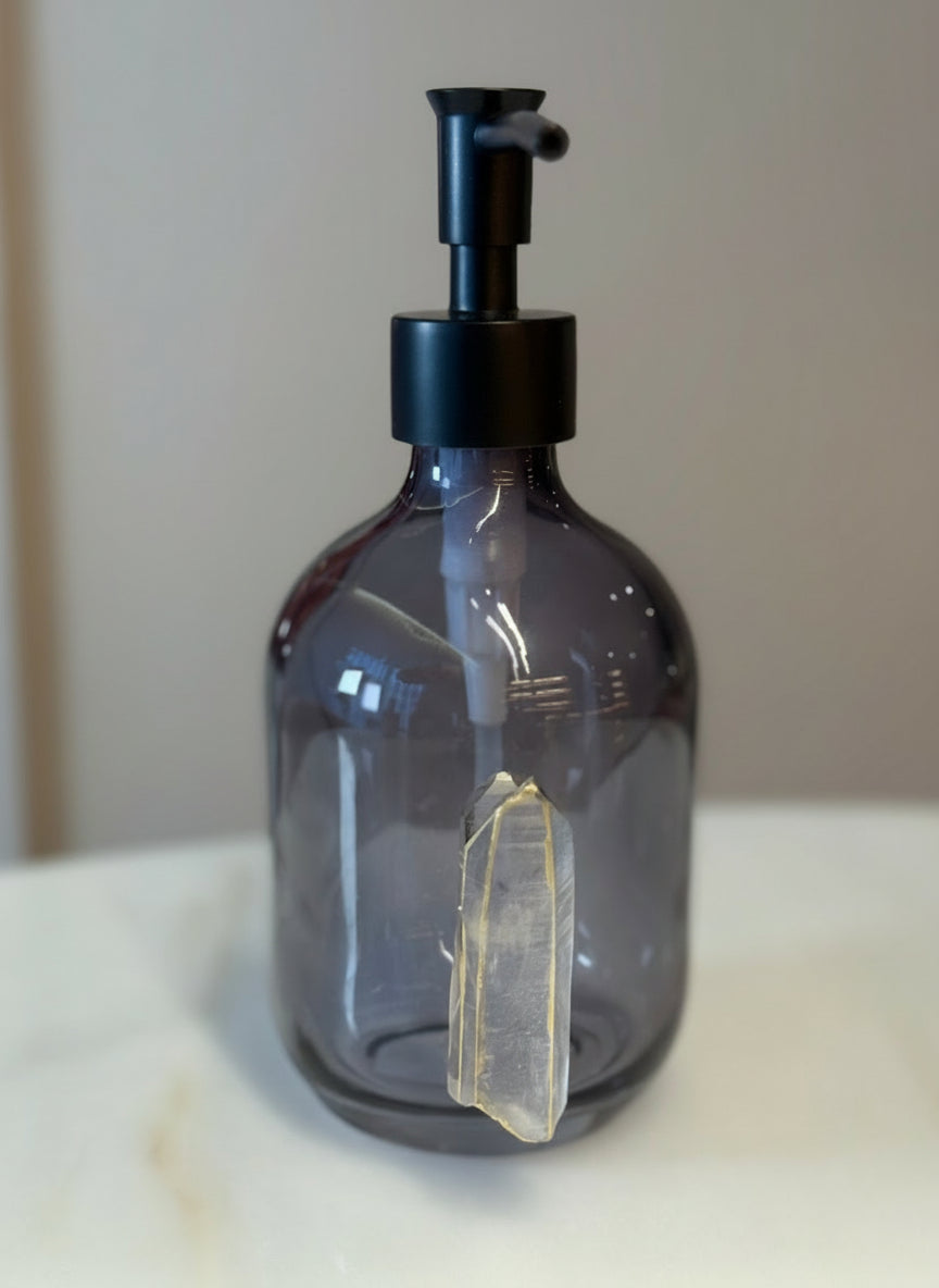 Vidro espesso fumado com Cristal Lemuriano lapidado e fixado manualmente já vem com o sabão gel incluído aroma Paradise Beach.